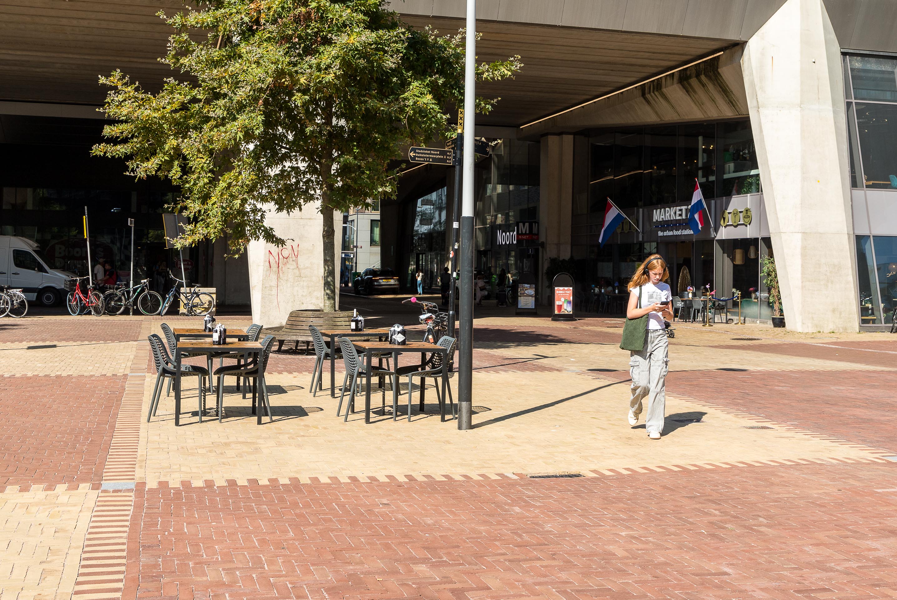 Bij metrostation Noord in Amsterdam is een levendig en uitnodigend stadsplein gerealiseerd, dat niet alleen functioneert als verkeersknooppunt, maar ook als aantrekkelijke verblijfsruimte. Met een ontwerp van Simon Sprietsma en uitgevoerd in opdracht van de gemeente Amsterdam, vormt dit plein een belangrijk onderdeel van het eindstation van de Noord-Zuidlijn en het nabijgelegen stadsdeelkantoor.
