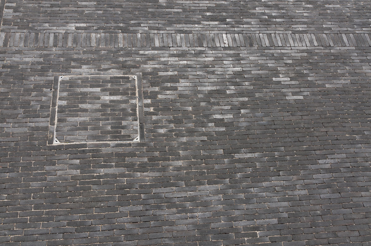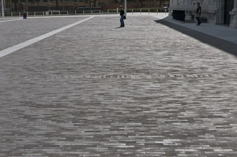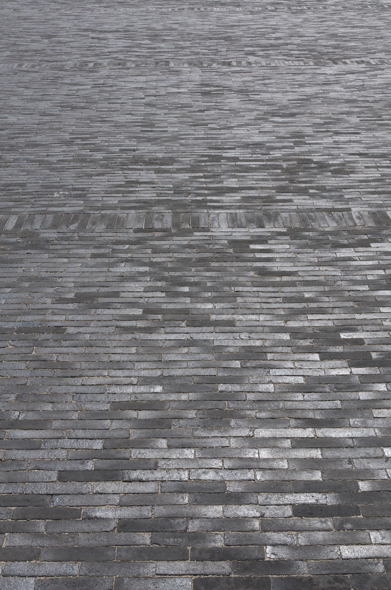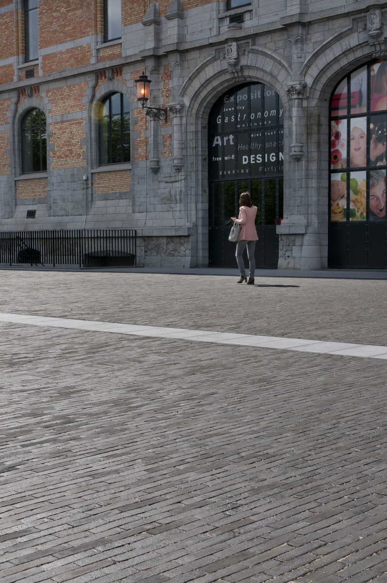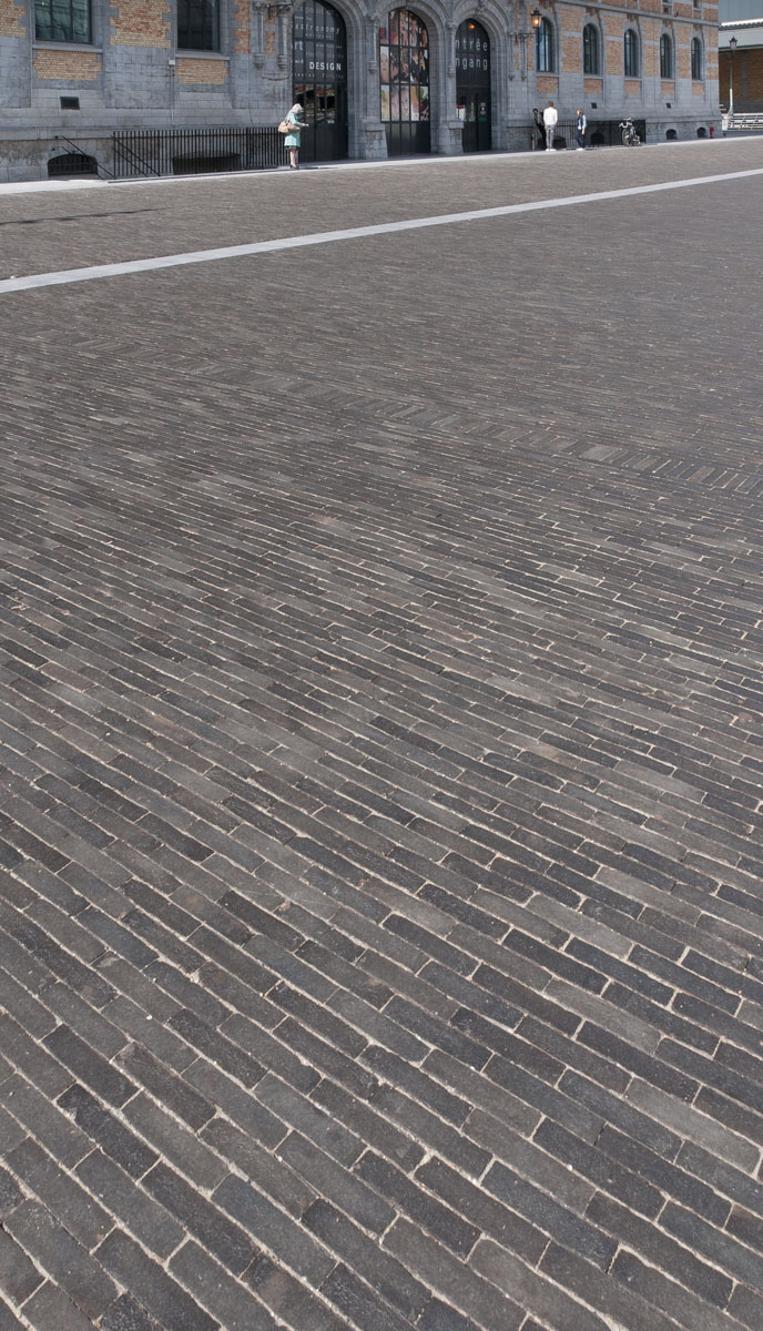 De stroken van blauwsteen die de oppervlakte doorkruisen, benadrukken het weidse gevoel dat opgewekt wordt wanneer je over het plein flaneert.