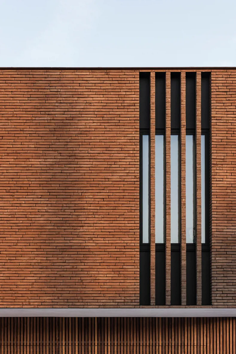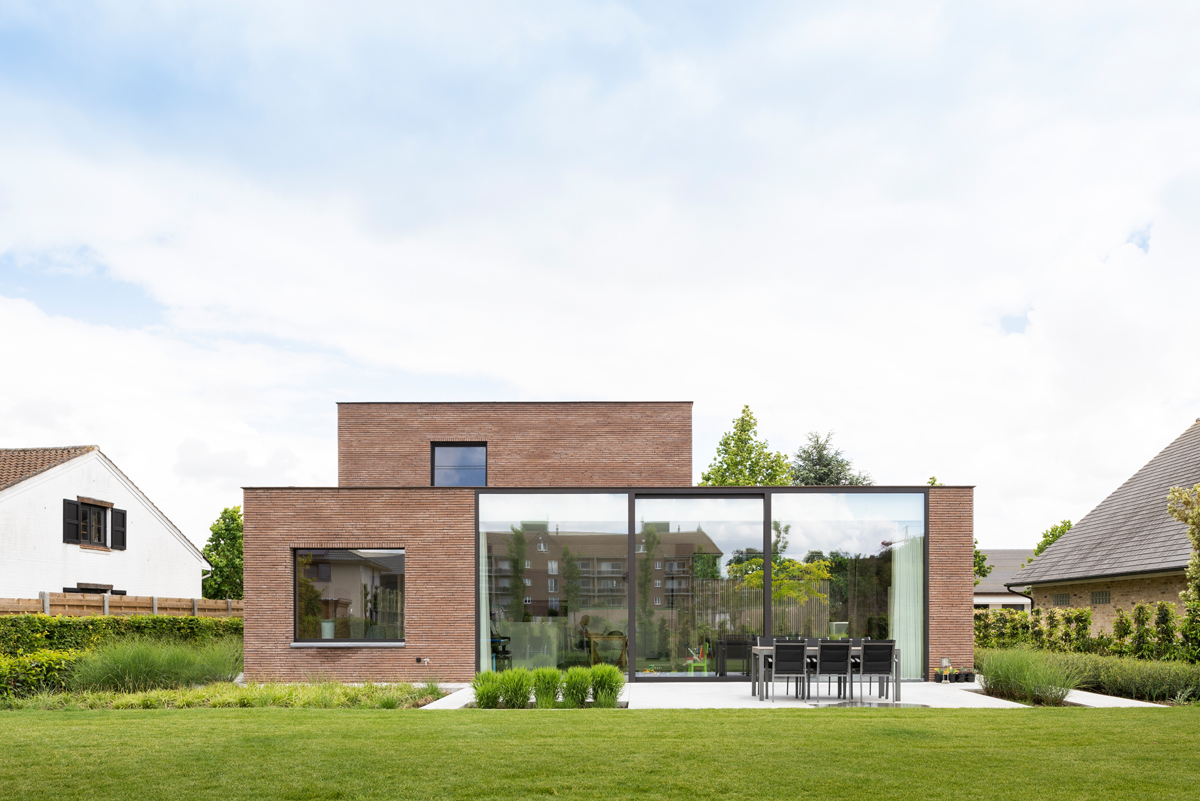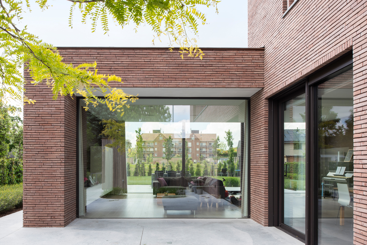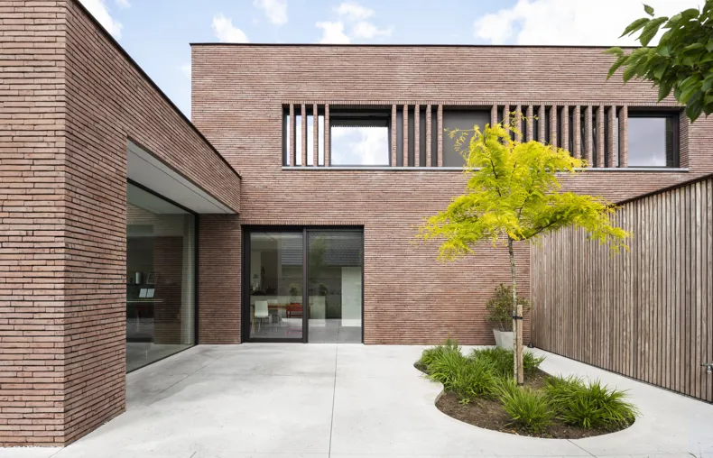 De smalle gevelsteen linea7 8012 bleek al snel de gepaste gevelsteen om ook de architecturale meerwaarde kracht bij te zetten. Dit door onder meer het accentueren van het horizontale karakter. De verwerking met dunbedmortel was een evidente keuze die bij deze gevelsteen makkelijk toe te passen is. De ramen aan de voor- en zijgevel zijn deels bedekt met ‘verticale bakstenen lamellen’ en worden zo mee opgenomen in het geheel. De verticale architecturale lijnen herhalen zich ook in de houten lamellen van de garagepoort en zorgen voor een harmonieuze visuele expressie.