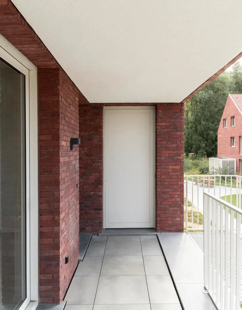 Om het coherente geheel te ondersteunen, koos het team bewust voor de NATURE7 Brick E van Vande Moortel. Deze roodbruine vormbaksteen, vervaardigd volgens de Wasserstrich-methode, behoort tot de Hand-Made collectie. Het ambachtelijke karakter en de natuurlijke nuance van deze duurzame steen sluiten perfect aan bij de wens van de bewonersgroep en de ontwerpers om een materiaal te gebruiken dat warmte en authenticiteit uitstraalt zonder te domineren.